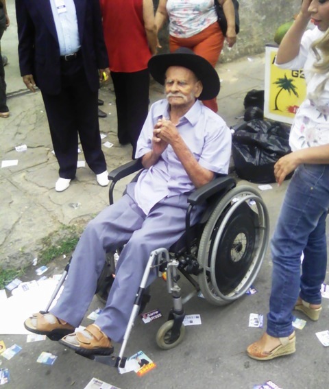 O aposentado José Rocha, de 93 anos de idade, diz que faz questão de votar, apesar de não ter a obrigatoriedade do voto, facultativo às pessoas com mais de 70 anos de idade. Morador da região do Veneta, ele veio acompanhado da filha para exercer o direito do sufrágio, na Escola Estadual Alfredo Sá. Cadeirante, José Rocha encontrou dificuldades para chegar à sua urna, situada no primeiro andar da escola. “Ainda bem que temos quem nos ajuda”, contou a sua filha. O aposentado foi levado nas costas por um amigo da família, que subiu um lance de escadas para que José chegasse até o seu local de votação.