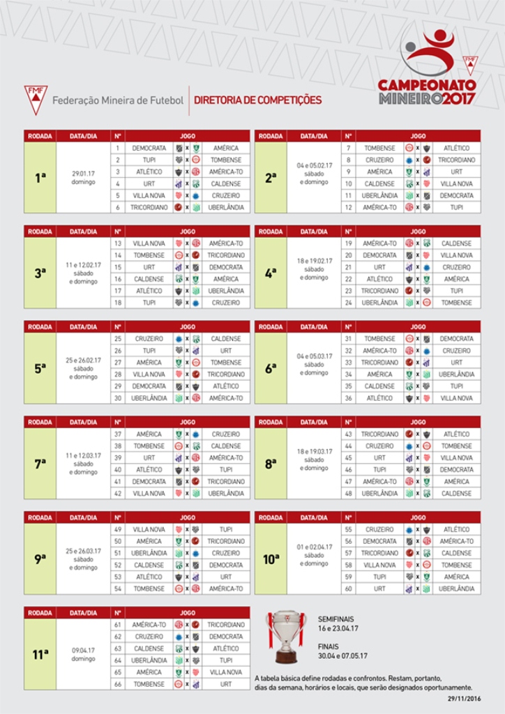 TEÓFILO OTONI – A Diretoria de Competições da Federação Mineira de Futebol (FMF) divulgou na última semana, a tabela de jogos da primeira fase e o Regulamento Específico da Competição para Campeonato Mineiro 2017 – Módulo I. Mantendo o formato das últimas edições, a competição da próxima temporada começa no dia 29 de janeiro e será decidida no dia 7 de maio. O América estreia no estadual diante do Atlético, em Belo Horizonte na abertura do Campeonato Mineiro. Na 6ª rodada o Mecão receberá o Cruzeiro, no estádio Nassri Mattar, no dia 04 ou 05 de março, com data ainda a ser definida. Na 8ª rodada o América volta a receber outro grande da capital em casa, desta vez, o América de Belo Horizonte, no dia 18 ou 19 de março (a definir).