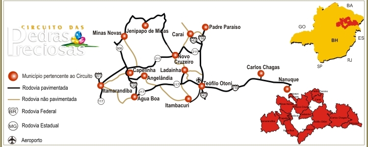 Com 19 municípios, todos localizados no Nordeste de Minas Gerais, essa região turística é conhecida pela delicadeza de seu artesanato, por sua natureza exuberante, que contempla fragmentos de mata atlântica, cerrado e belíssimas formações rochosas. Além disso, os municípios do Circuito são conhecidos por sua gastronomia peculiar, pelos festejos culturais e religiosos que acontecem ao longo do ano. E claro, pelos convidativos rios, lagos e cachoeiras e, também, por sua quantidade e diversidade de pedras preciosas que encantam e atraem visitantes de todas as partes do mundo. Estar nesse destino é conhecer de perto a essência das minas que deram fama as Gerais. É sentir a hospitalidade do autêntico mineiro e apreciar atrações únicas, que fazem deste, um lugar ideal para vivenciar novas experiências.