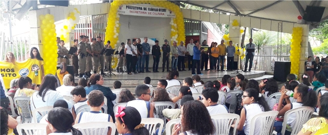 TEÓFILO OTONI – Uma legião de estudantes da rede pública de ensino abrilhantou o Dia D do Movimento Maio Amarelo ocorrido na manhã de 23/05, na Praça Tiradentes. A solenidade reuniu ainda representantes dos órgãos e empresas envolvidas no movimento que visa chamar a atenção da sociedade para práticas seguras no trânsito. Desde o início do mês tem ocorrido uma série de ações na cidade em torno do Maio Amarelo, promovido pela Superintendência Regional de Saúde (SRS), 37ª Superintendência Regional de Ensino (SRE) e Departamento de Edificações e Estradas de Rodagem de Minas Gerais (DEER), com apoio de várias parceiros no setor público e privado. A Prefeitura de Teófilo Otoni está engajada na causa, divulgando a proposta do Maio Amarelo e presente também no Dia D.