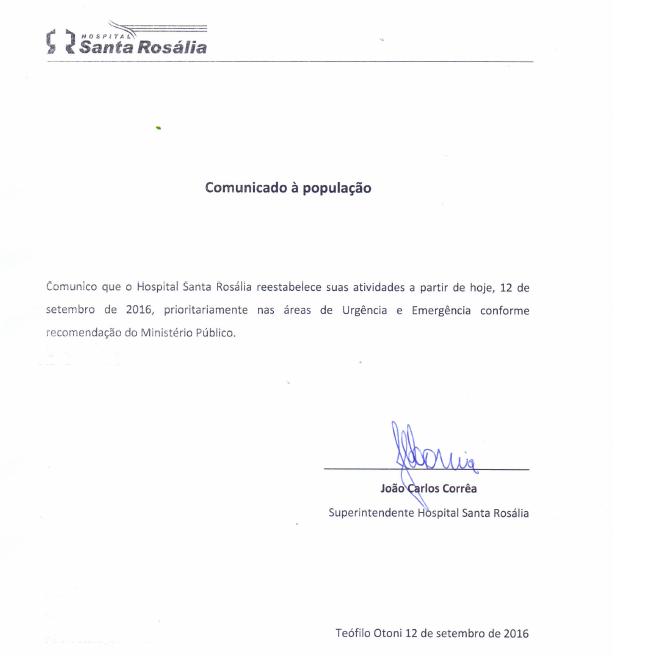 Em nota oficial publicada nesta segunda-feira (12), o superintendente do HSR, João Carlos Corrêa informou que o Hospital Santa Rosália restabeleceu suas atividades, prioritariamente nas áreas de Urgência e Emergência conforme recomendação do Ministério Público.