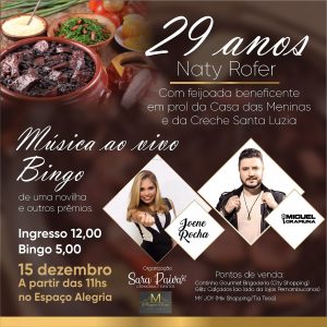 NATY ROFER – Ocorrerá dia 15 de dezembro, no domingo, no Espaço Alegria no Ipiranga, onde teremos bingo de uma novilha, musica ao vivo com Miguel Grapiuna e Joene Rocha, sorteios e muita diversão.