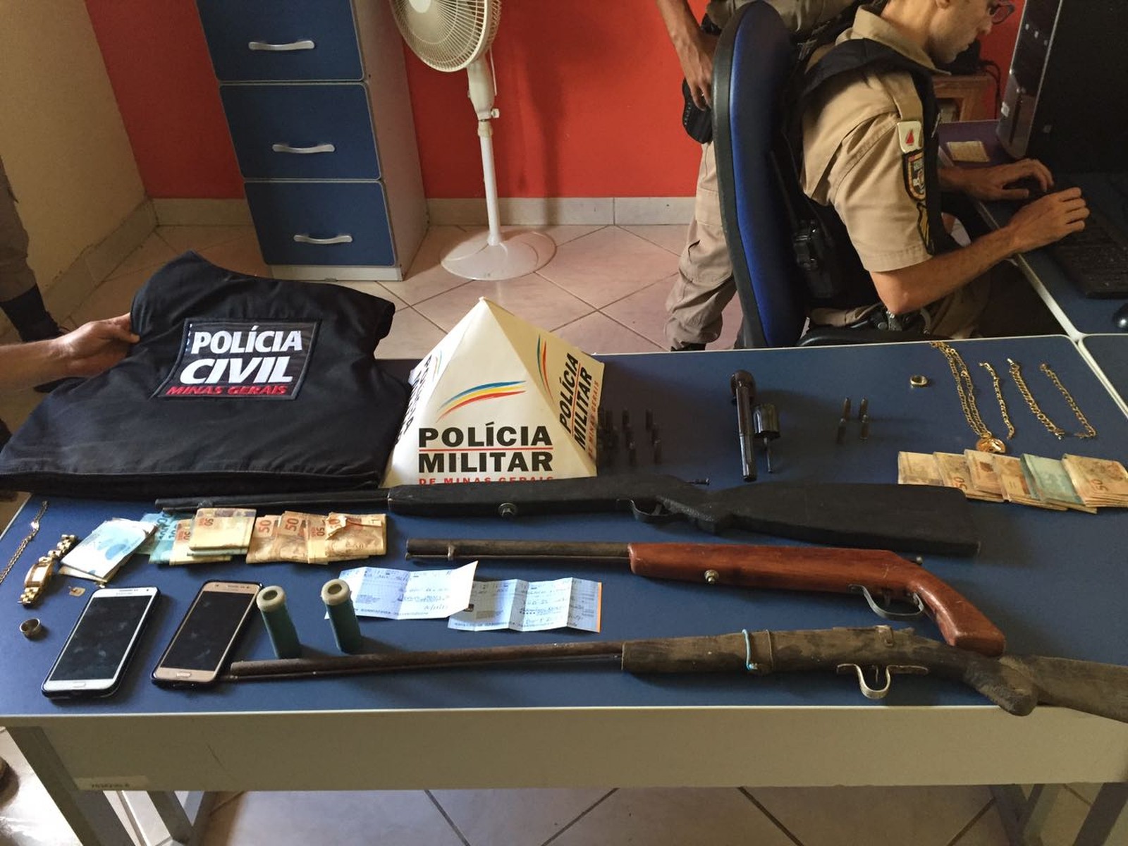 Foram presos três irmãos, de 40, 50 e 52 anos. No total, foram apreendidos mais de R$ 41 mil em dinheiro, quase R$ 33 mil em cheques, notas promissórias, cuja soma ultrapassa R$ 100 mil, 11 dólares, além de joias e documentos de transmissão de terras.