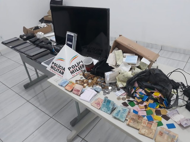 A PM apreendeu diveros tablets, celulares, talonários e uma televisão. Também foi apreendido cerca de mil reais em dinheiro e dois cheques no valor de R$ 2.050.