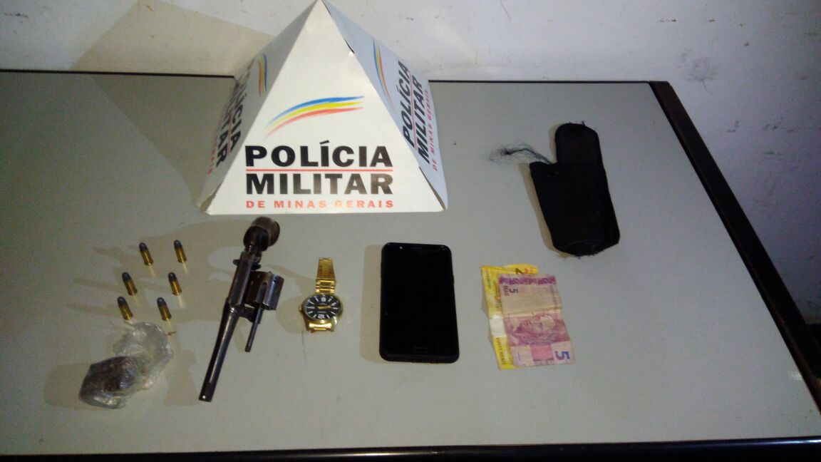 O veículo foi acompanhado pela PM e ao parar, os indivíduos em fuga adentraram dentro de uma residência. A PM conseguiu alcançar e abordar o condutor do veículo, um jovem de 24 anos que dispensou um revólver calibre 22 municiado com seis munições. Com ele também foi localizado: um tablete de maconha, um relógio, um celular e R$ 25 em dinheiro.