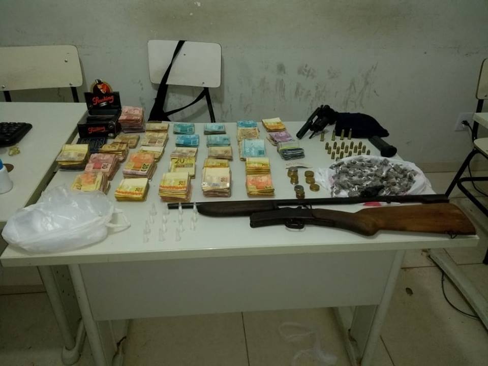 No local, a PM abordou P.S.R., de 24 anos de idade. Após busca pessoal a polícia foi até a casa do suspeito. Ainda de acordo com os militares, durante os trabalhos foram apreendidos um total de 158 buchas de maconha, 15 pinos de cocaína, 01 carregador de pistola, 09 munições calibre 38, 01 revólver do mesmo calibre, 01 espingarda cartucheira e R$ 26.279 em dinheiro .