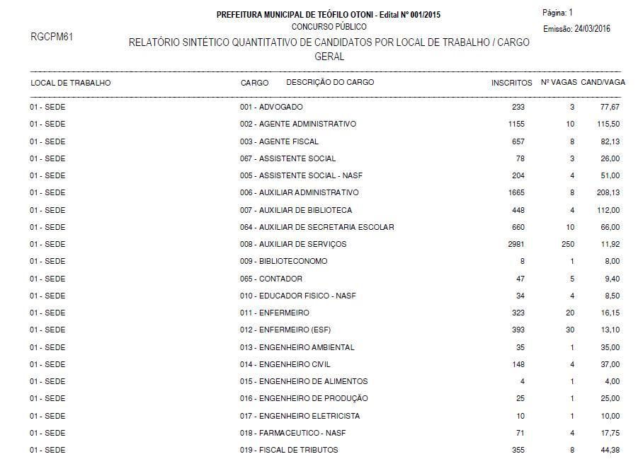 TEÓFILO OTONI – A MSM Consultoria & Projetos LTDA, responsável pela realização do Concurso Público da Prefeitura Municipal divulgou no início desta semana um balanço do número de inscrições e da concorrência entre os candidatos para as vagas oferecidas. Ao todo foram 14.790 inscrições homologadas, sendo o maior número para o cargo de Auxiliar de Serviços, o total de 2.981 candidatos inscritos para as 250 vagas disponíveis. O relatório mostrou também que não houve inscritos para quatro funções oferecidas no edital (Médico Endocrinologista, Médico Hematologista, Médico Oftamologista e Médico Pneumologista).