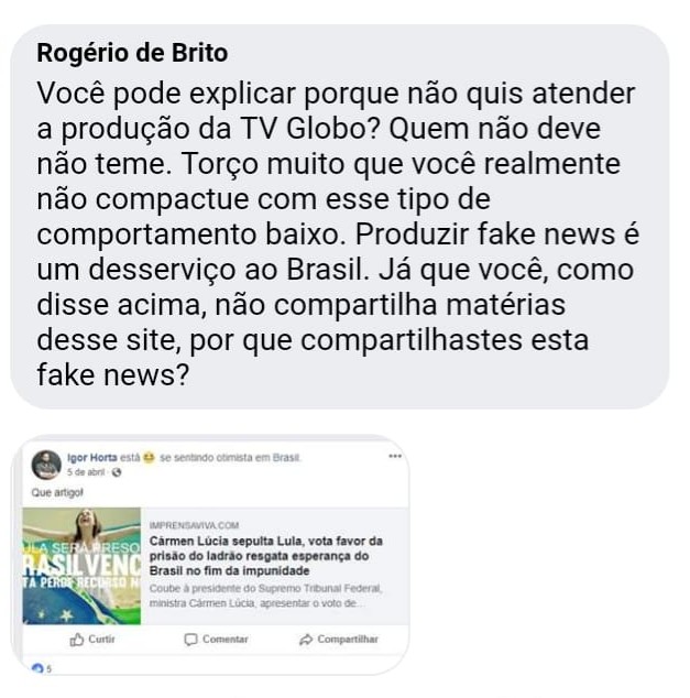 Igor Horta disse trabalhar com a criação de site, e que tem clientes em todo o Brasil, não sendo responsável pelos conteúdos das atualizações. Apesar da negativa de envolvimento direto na customização do site, em resposta ao post de Igor, um internauta postou print de um compartilhamento do perfil social do Imprensa Viva, no qual uma fake news foi reproduzida por Igor.