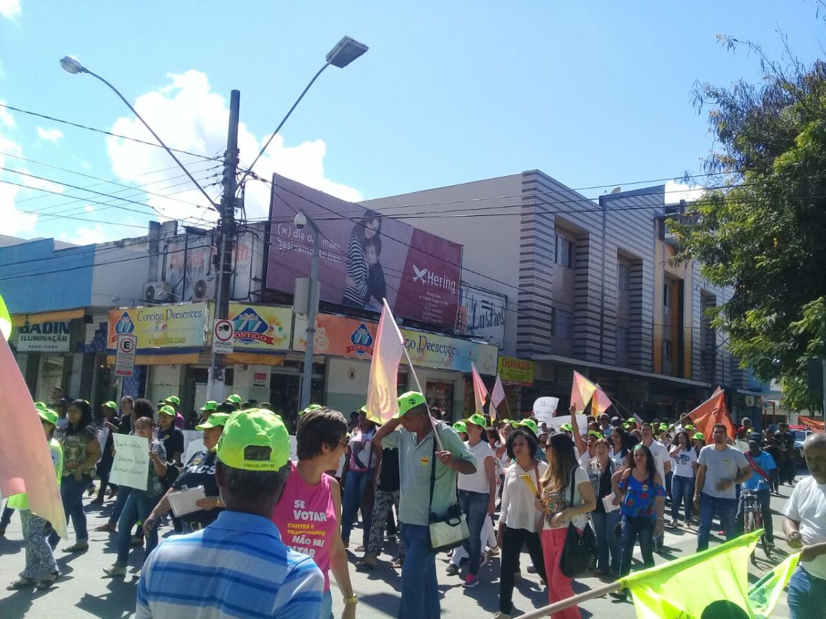 TEÓFILO OTONI – Pela segunda vez em pouco mais de uma semana, os servidores públicos municipais foram às ruas na manhã desta quarta-feira (2). A paralisação das atividades foi pelo mesmo motivo do movimento do último dia 23 de abril: A Campanha Salarial 2018. Desta vez, a novidade em relação ao último protesto foi o início da “Operação Tartaruga” (diminuição do ritmo de trabalho) empreendida pelos profissionais da Educação, e que deve durar até pelo menos sexta-feira (4). Depois de uma Assembleia, na porta do sindicato da categoria, o SINDISETO, os servidores, reforçados pelos agentes comunitários de saúde, se dirigiram à Prefeitura. “Fomos recebidos pelo secretário de Governo, Pio de Castro Mota, e foi marcada uma reunião com o prefeito Daniel Sucupira, para discussão das nossas reivindicações”, informou o presidente do SINDISETO, José Antônio Esteves Guedes